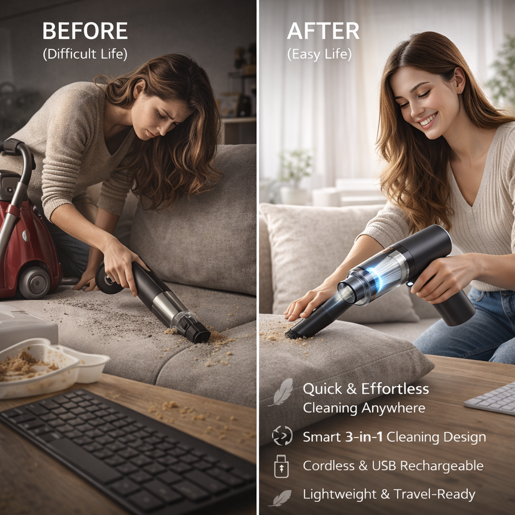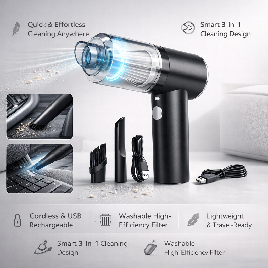 • Quick & Effortless Cleaning Anywhere – Just switch it on and start cleaning instantly. Powerful suction removes dust, crumbs, hair, and debris from cars, sofas, desks, keyboards, and tight corners with ease.